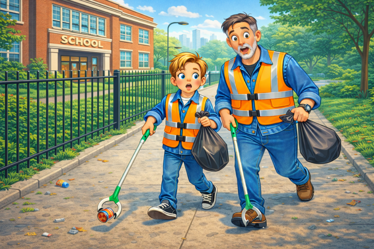 Zane en opa Ben waren op weg naar het milieueiland om hun eigen oud papier en karton weg te brengen. Zane had er zin in, hij mocht altijd de dozen door de gleuf duwen en luisteren naar het 'bonk'-geluid als ze beneden in de grote container vielen.